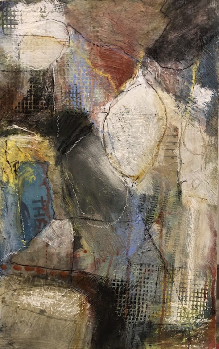 Acrylic paint, acrylic ink, collage, stencil, charcoal and pastel