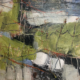 a mixed media piece looking west along the shore towards Hunstanton in West Norfolk, 49 x 49 cm on 6mm mdf board. Acrylic paint, acrylic ink, collage, stencil, charcoal and pastel.