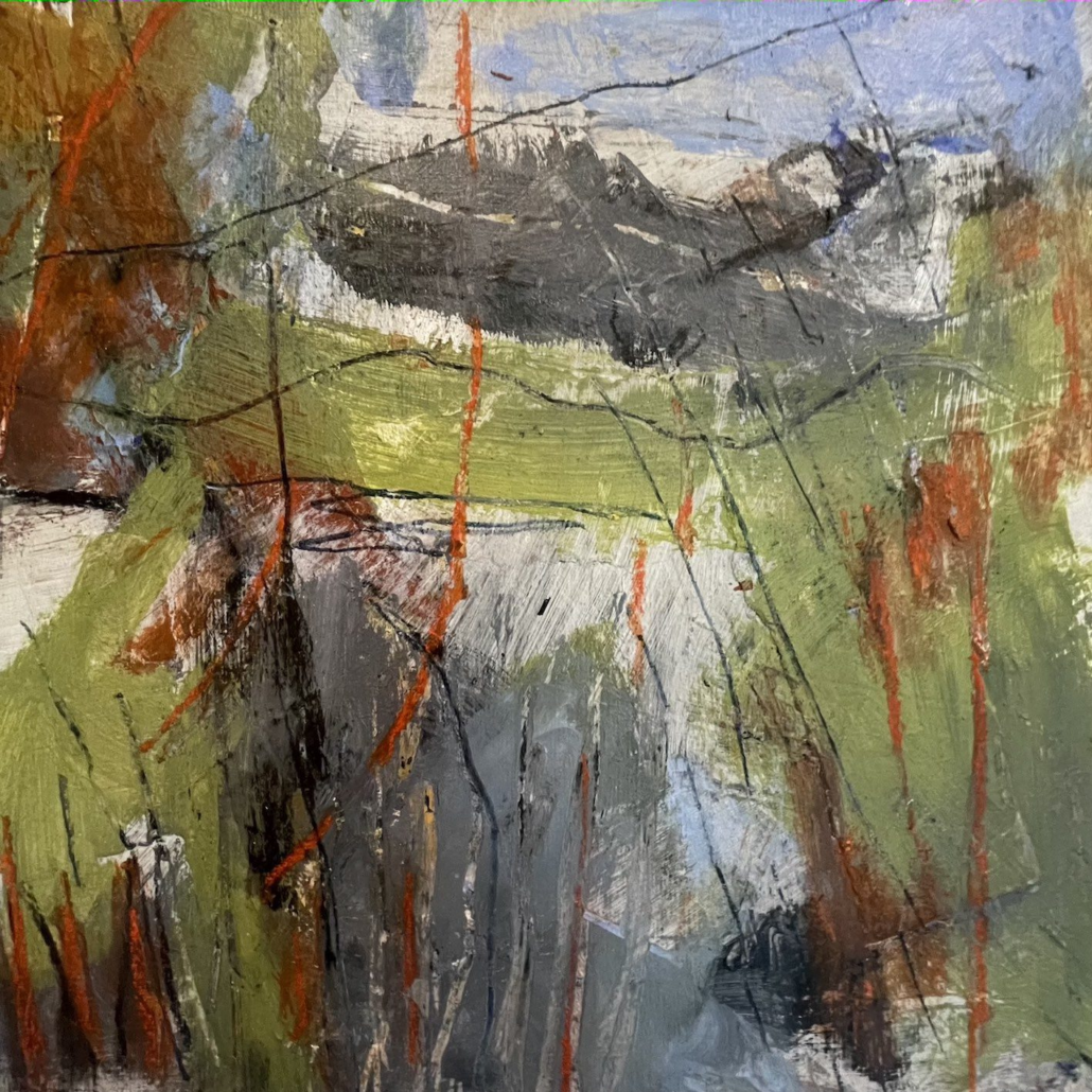 Acrylic paint, acrylic ink, collage, crayon, charcoal and pastel