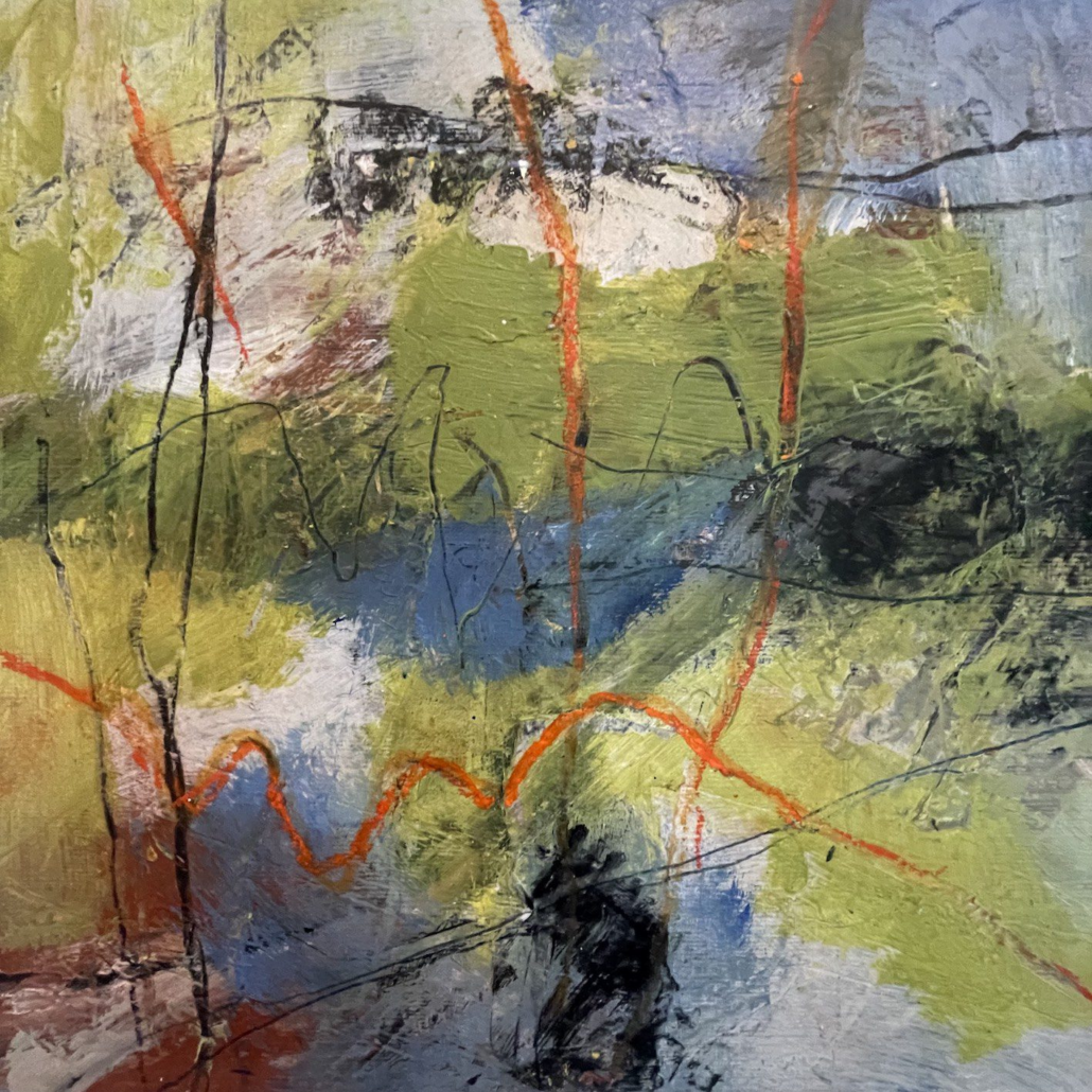 Acrylic paint, acrylic ink, collage, crayon, charcoal and pastel